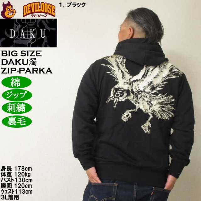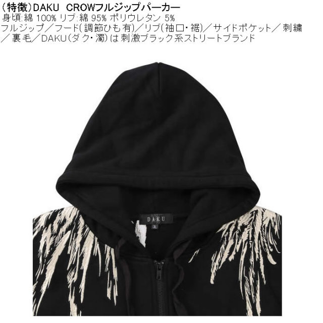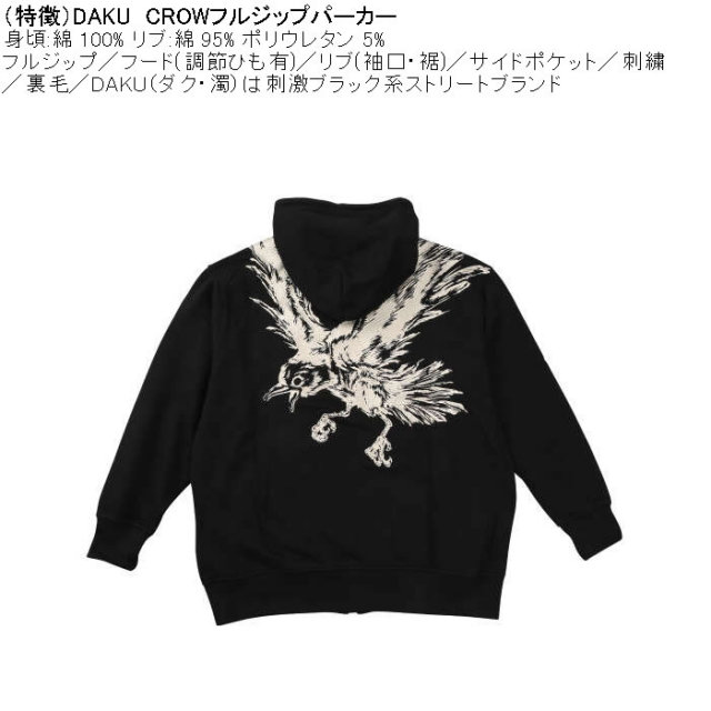 カラスの刺繍が存在感を放つ、DAKUのフルジップパーカー。