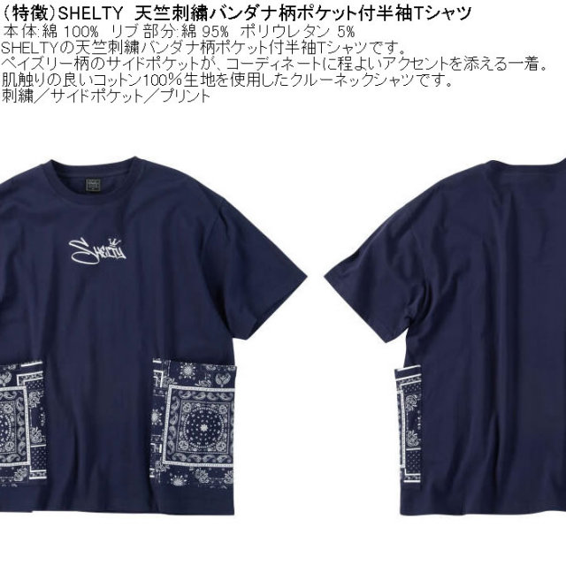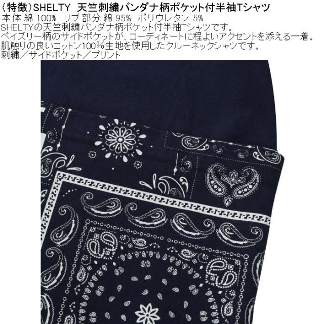 SHELTYの天竺刺繍バンダナ柄ポケット付半袖Tシャツです。