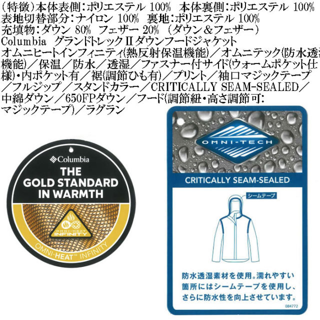 | ― | 本体表側:ポリエステル 100% 本体裏側:ポリエステル 100% 表地切替部分:ナイロン 100% 裏地:ポリエステル 100% 充填物:ダウン 80% フェザー 20% |