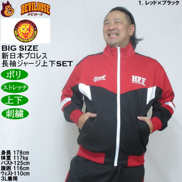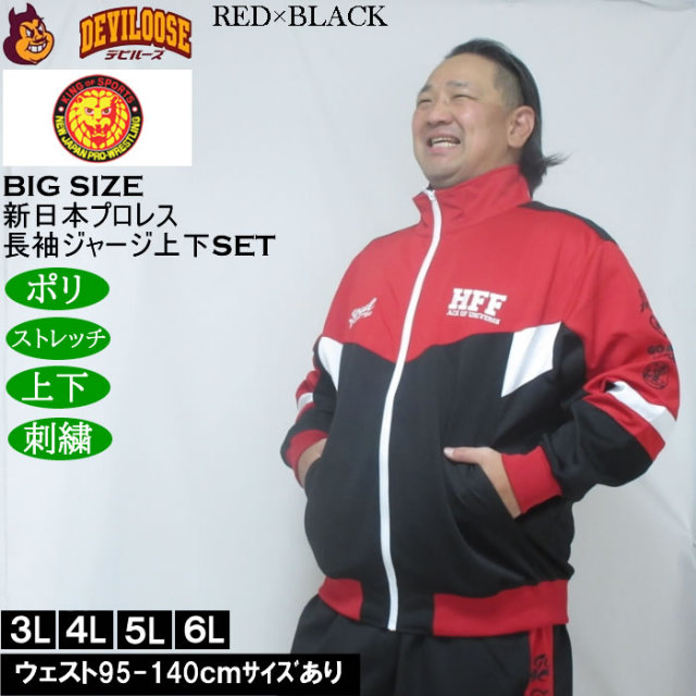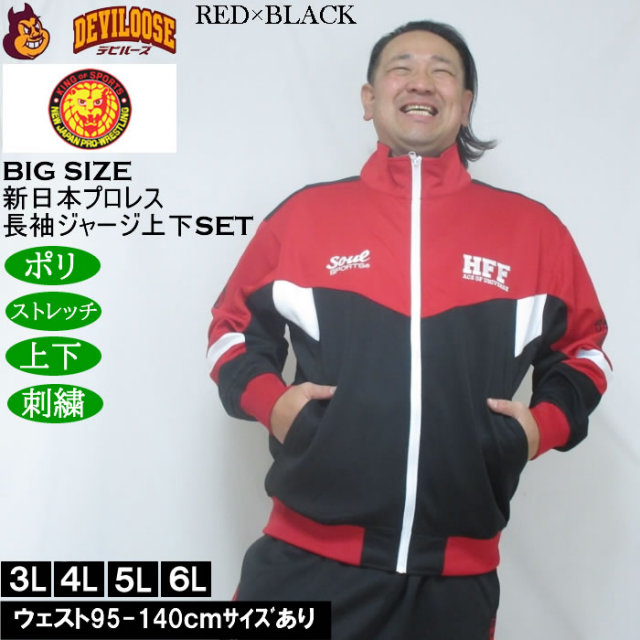 ブラック×レッド×ホワイトのカラーリングが印象的なジャージセットアップ。